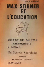 Barrué, Jean. Lapeyre, Jean. Grave, Jean. — Max Stirner et l’éducation / J. Barrué. Qu’est-ce qu’être anarchiste / Aristide Lapeyre. En société anarchiste, comment se conduira l’individu ? / J. Grave. — Paris : Publico, [1974 ?]. — 8-57 p.